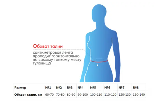 | Обхват талии, см | 60-70 | 70-80 | 80-90 | 90-100 | 100-110 | 110-120 | 120-130 | 130-140 |