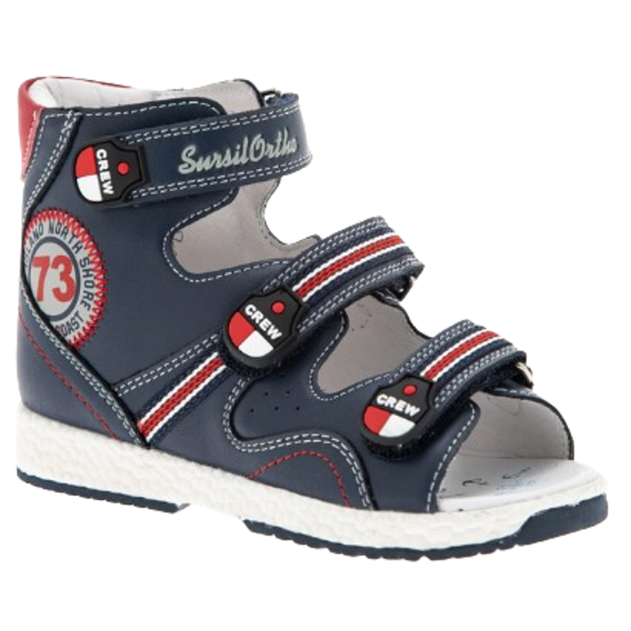 Сандалии детские антиварусные для мальчиков. Антиварусная ортопедическая обувь рекомендована для консервативного лечения стоп детей с приведением переднего отдела стоп (косолапостью), врожденной эквино-варусной деформацией с приведением переднего отдела стоп, а также после хирургической коррекции косолапости. Конструкция обуви, с высоким жестким задником и продленными берцами, обеспечивает стабилизацию заднего отдела стопы и фиксацию переднего отдела в положении отведения 8 градусов. Каблук Томаса продленный с внешней стороны предотвращает завал наружу. Плотная подошва в задней части и пластичная в зоне пучков, обеспечивает естественную работу мышц стопы ребенка. Ремешки с липучкой велкро дают возможность легко надеть и отрегулировать обувь по стопе. Для профилактики натирания в верхней части задника встроена мягкая вставка и имеются боковые подушечки в зоне мыщелков. Антискользящий протектор подошвы обеспечивает безопасность ходьбы.