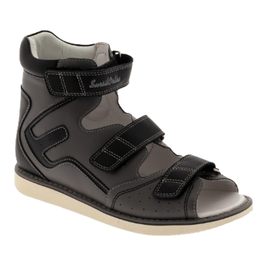 Ортопедические стабилизирующие сандалии. Рекомендуются при плоскостопии, плоско-вальгусной деформации стопы, неврологических нарушений, церебральном параличе. Конструкция обуви с жестким задником и продленными берцами стабилизирует задний отдел стопы в анатомически правильном положении, обеспечивая устойчивость походки. Подошва AntiValgus с изменением градуса пяточной зоны исключает заваливание стопы вовнутрь. Верх модели и внутренняя подкладка изготовлены из натуральной кожи. Для минимизации давления и профилактики натирания голени верх задника оснащен мягкой вставкой. Три ремешка с липучками велкро обеспечивают полную раскрываемость обуви для облегчения надевания. В модели отсутствует супинатор, что позволяет использовать стельки индивидуального изготовления. Эластичная амортизирующая подошва из резины отлично поглощает ударные нагрузки. Обувь зарегистрирована в Росздравнадзоре как мед. изделие.