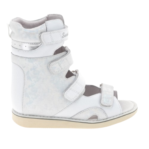 Ортопедические сандалии (тутор) показаны для детей с деформацией стоп при ДЦП, гемипарезе, после операций на стопе и голеностопном суставе. Конструкция обуви оснащена высоким жестким задником и продленными берцами, полностью фиксирует задний отдел стопы ребенка, что способствует правильному положению всей нижней конечности и обеспечивает устойчивость походки. Подошва AntiValgus с изменением градуса пяточной зоны исключает заваливание стопы вовнутрь. Верх модели выполнен из натуральной кожи и вставок из текстиля. Внутренняя подкладка модели изготовлена из натуральной кожи. Для смягчения давления и профилактики натирания голени верх задника оснащен мягкой вставкой. Четыре ремешка с липучками велкро обеспечивают полную раскрываемость обуви для облегчения надевания. В модели отсутствует супинатор, что позволяет использовать стельки индивидуального изготовления. Легкая подошва ЭВА с антискользящим резиновыми вставками для безопасной ходьбы. Обувь зарегистрирована в Росздравнадзоре как мед. изделие.