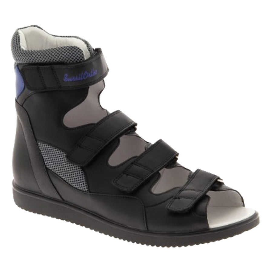 Ортопедические сандалии (тутор) показаны для детей с деформацией стоп при ДЦП, гемипарезе, после операций на стопе и голеностопном суставе. Конструкция обуви оснащена высоким жестким задником и продленными берцами, полностью фиксирует задний отдел стопы ребенка, что способствует правильному положению всей нижней конечности и обеспечивает устойчивость походки. Модель оснащена продленным каблуком Томаса, что обеспечивает правильную установку стопы и предотвращает ее завал вовнутрь. Верх модели изготовлен из натуральной кожи и дышащего текстиля, подкладка из кожи. Для смягчения давления и профилактики натирания голени верх задника оснащен мягкой вставкой. Четыре ремешка с липучками велкро обеспечивают полную раскрываемость обуви для облегчения надевания. В модели отсутствует супинатор, что позволяет использовать стельки индивидуального изготовления. Обувь зарегистрирована в Росздравнадзоре как мед. изделие.