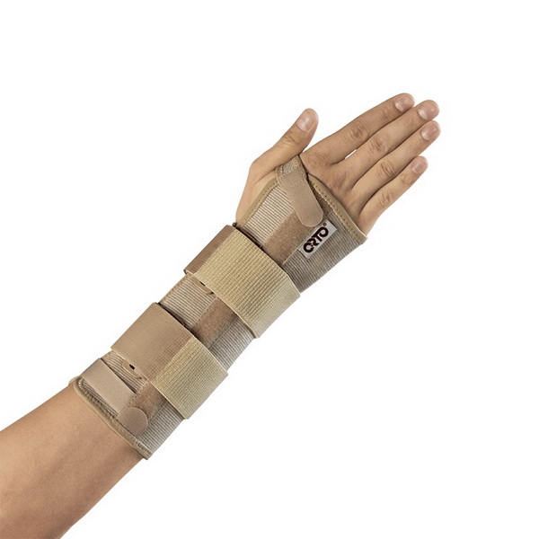 Шина жесткая из гипоаллергенной нити с керамическим напылением, усилена профилируемыми съемными ребрами жесткости (широким по ладонной поверхности, узким - по тыльной) и двумя эластичными фиксирующими ремнями.