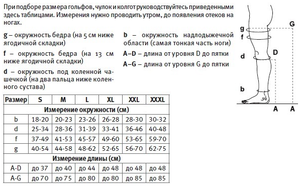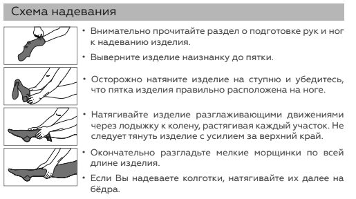 - Рекомендации по использованию: надевать утром до появления отеков, при снятии на 10-15 минут отдыхать с ногами в возвышенном положении; ухаживать за ногтями и кож