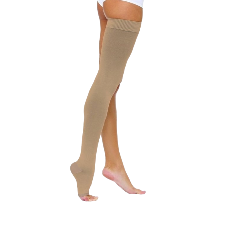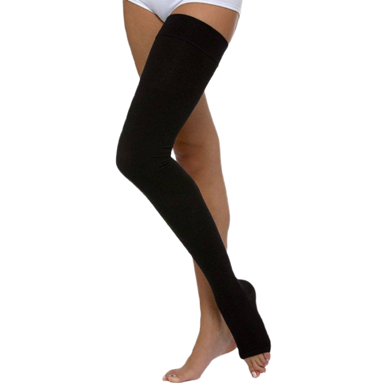 Чулки компрессионные до бедра с открытым мыском и с силиконом, 2 класс компрессии (22-32 мм рт.ст. ГОСТ Р 58236) предназначены для лечения варикозного расширения вен нижних конечностей, лимфостаза, посттравматических осложнений нижних конечностей, при артрозе и артрите, при отеках после снятия гипсовой повязки, а также для профилактики тромбоэмболии в до- и послеоперационный период.