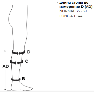 | Размер | Окружность лодыжки (B) | Окружность голени (C) | окружность голени, ниже подколенной складки (D) |