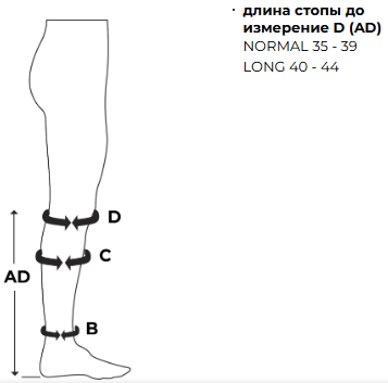 | Размер | Окружность лодыжки (B) | Окружность голени (C) | окружность голени, ниже подколенной складки (D) |