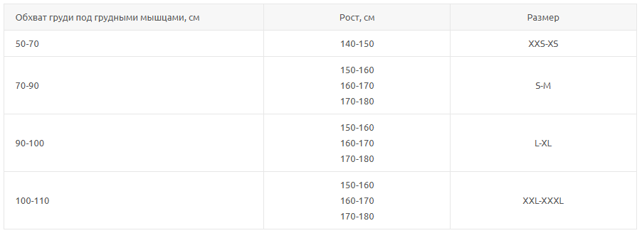 Таблица соответствия корректора осанки
