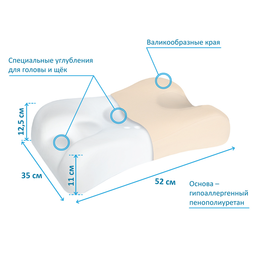 - Анатомичная форма с валикообразными краями и углублениями для головы и щёк