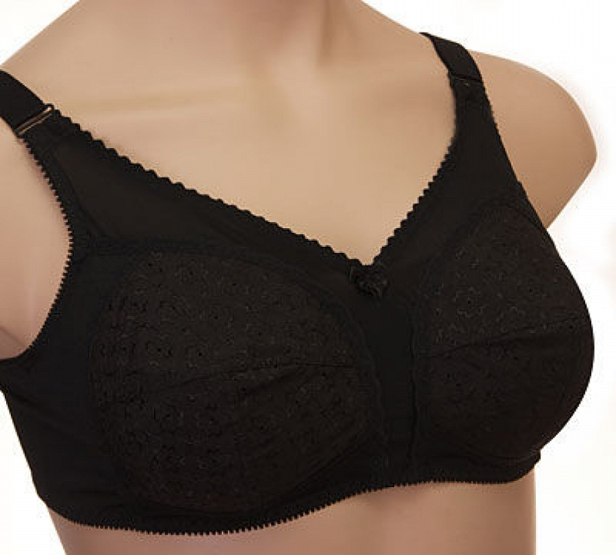 Бюстгальтер для фиксации протеза молочной железы из эластичного кружева и эластичного трикотажного полотна, с втачными карманами для протеза из х/б трикотажного полотна.