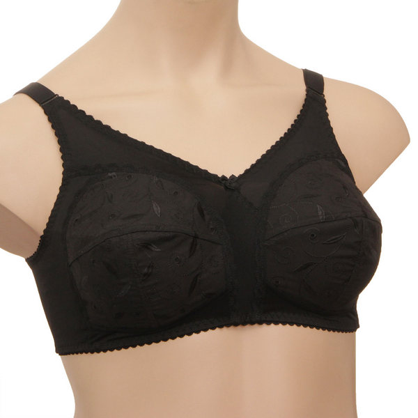 Бюстгальтер из х/б шитья, эластичного полотна, с втачными карманами для протеза из х/б трикотажного полотна. Чашка мягкая. Пояс с застежкой сзади на 3 крючка. Бретель широкая, эластичная, с регулировкой длины спереди. Отделка – бантик.
