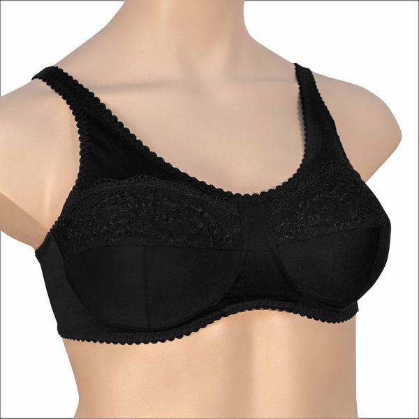 Бюстгальтер из вышитого кружева на неэластичной сетке, трикотажного полотна, эластичного полотна, с втачными карманами для протеза из х/б трикотажного полотна. Чашка мягкая. Пояс с застежкой сзади на 1-3 крючка. Бретель широкая, эластичная, с регулировкой длины сзади. Отделка – бантик.
