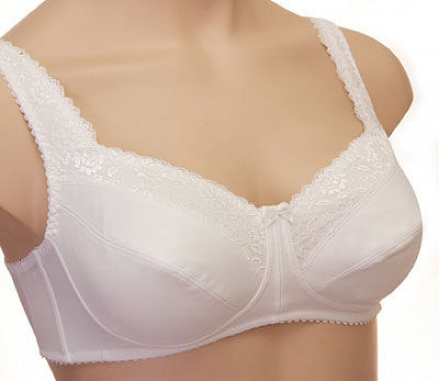 Бюстгальтер для фиксации протеза молочной железы из эластичного кружева и эластичного трикотажного полотна, с втачными карманами для протеза из х/б трикотажного полотна.