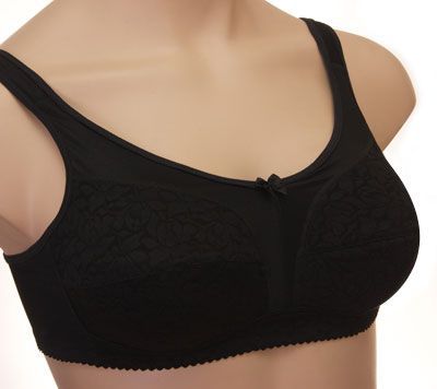 Бюстгальтер для фиксации протеза молочной железы из эластичного кружева и эластичного трикотажного полотна, с втачными карманами для протеза из х/б трикотажного полотна.