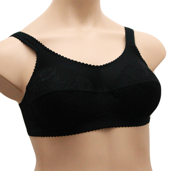 Бюстгальтер для фиксации протеза молочной железы из вышитого кружева на неэластичной сетке, эластичного полотна, с втачными карманами для протеза из х/б трикотажного полотна. Чашка мягкая. Пояс с застежкой сзади на 2-3 крючка. Бретель широкая, на дубляже с хлопком, с регулировкой длины сзади.