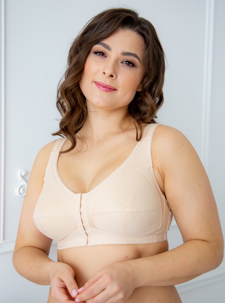 Бюстгальтер из неэластичного трикотажного полотна, эластичного полотна, с втачными карманами для протеза из х/б трикотажного полотна. Чашка мягкая. Застежка фронтальная на 7-8 крючков. Пояс с застежкой сзади на 2-3 крючка. Бретель широкая, на дубляже с хлопком, с регулировкой длины сзади.