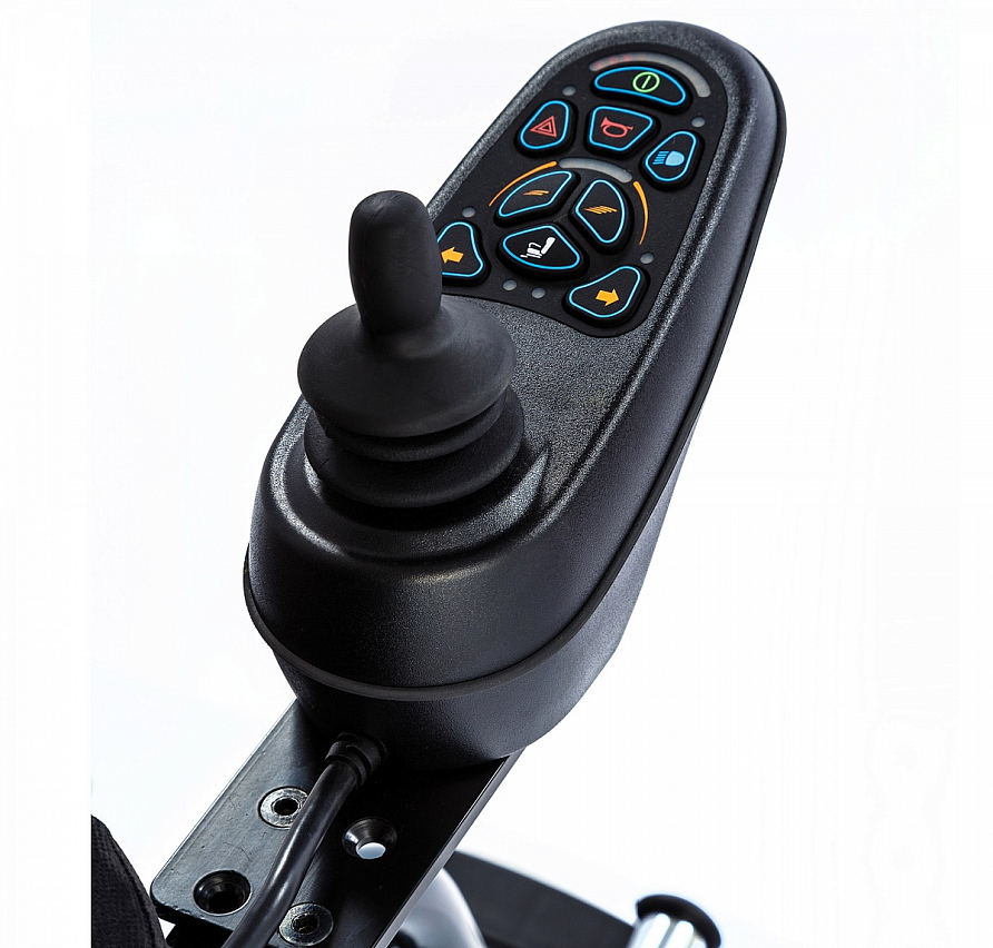 - На подлокотнике установлен многопозиционный джойстик для самостоятельного управления коляской. Джойстик возможно установить, как под левую, так и под правую руку.