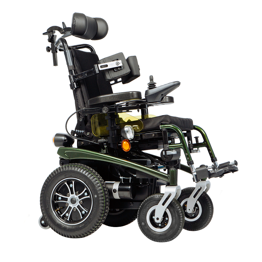 - Инвалидная электроколяска оборудована съемным подголовником, регулируемым по высоте и углу наклона.