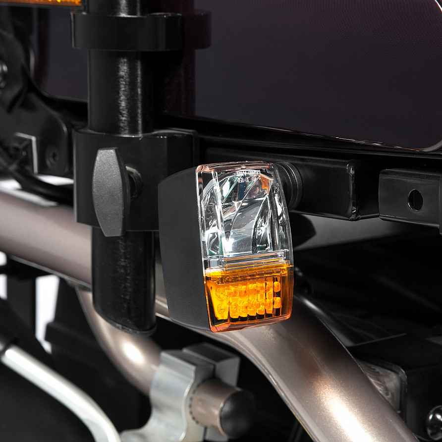 - Передний светодиодный фонарь белого цвета и передний указатель поворота с мигающим светом (оранжевый).
