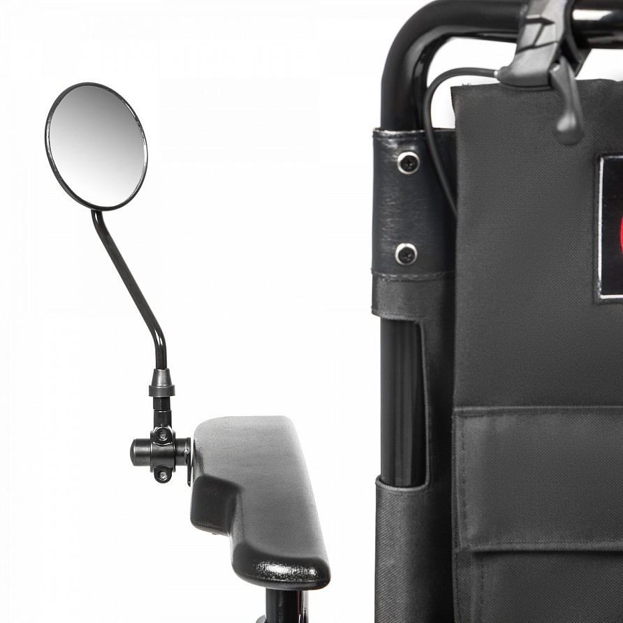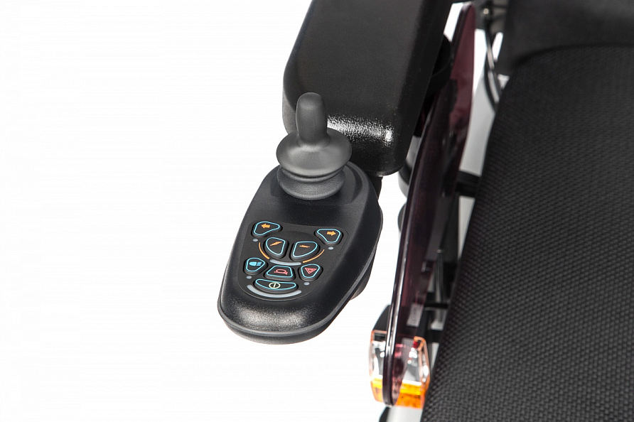 - На подлокотнике установлен многопозиционный джойстик для самостоятельного управления коляской.