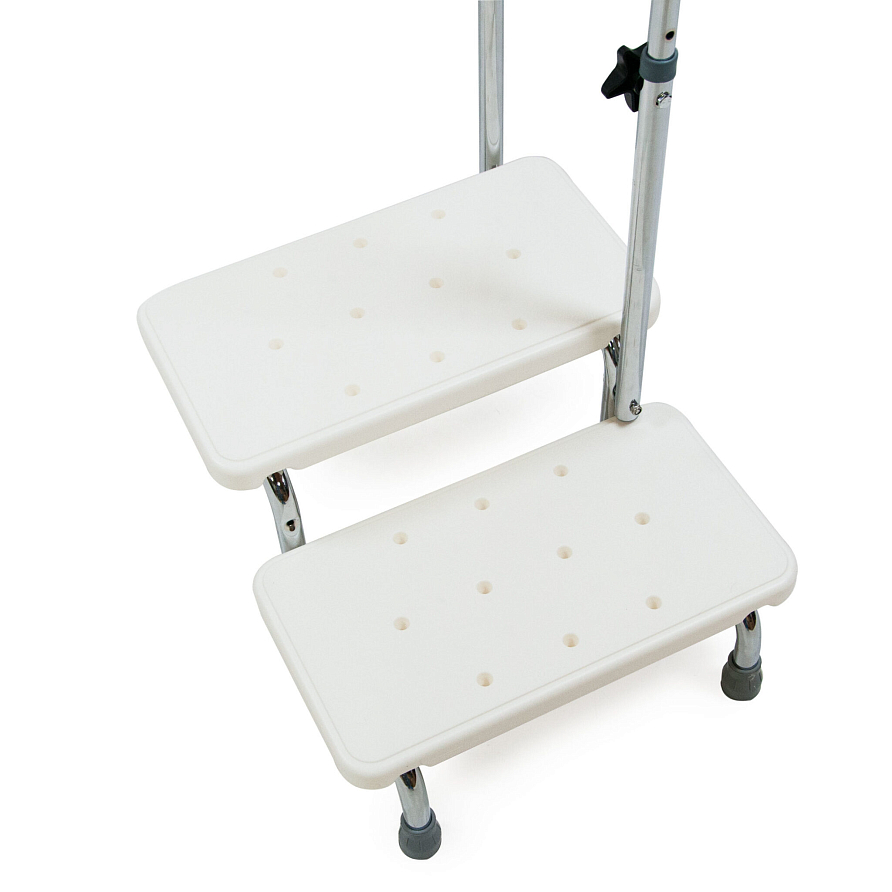 Ступени выполнены из высокопрочного рифленого пластика, устойчивого к воздействию воды. Поручень регулируется по высоте в трех положениях. Ребристая поверхность и дренажные отверстия ступеней предотвращают скольжение. Рама конструкции из хромированной стали защищена от коррозии. Ступень устойчива и не скользит по полу благодаря резиновым наконечникам.