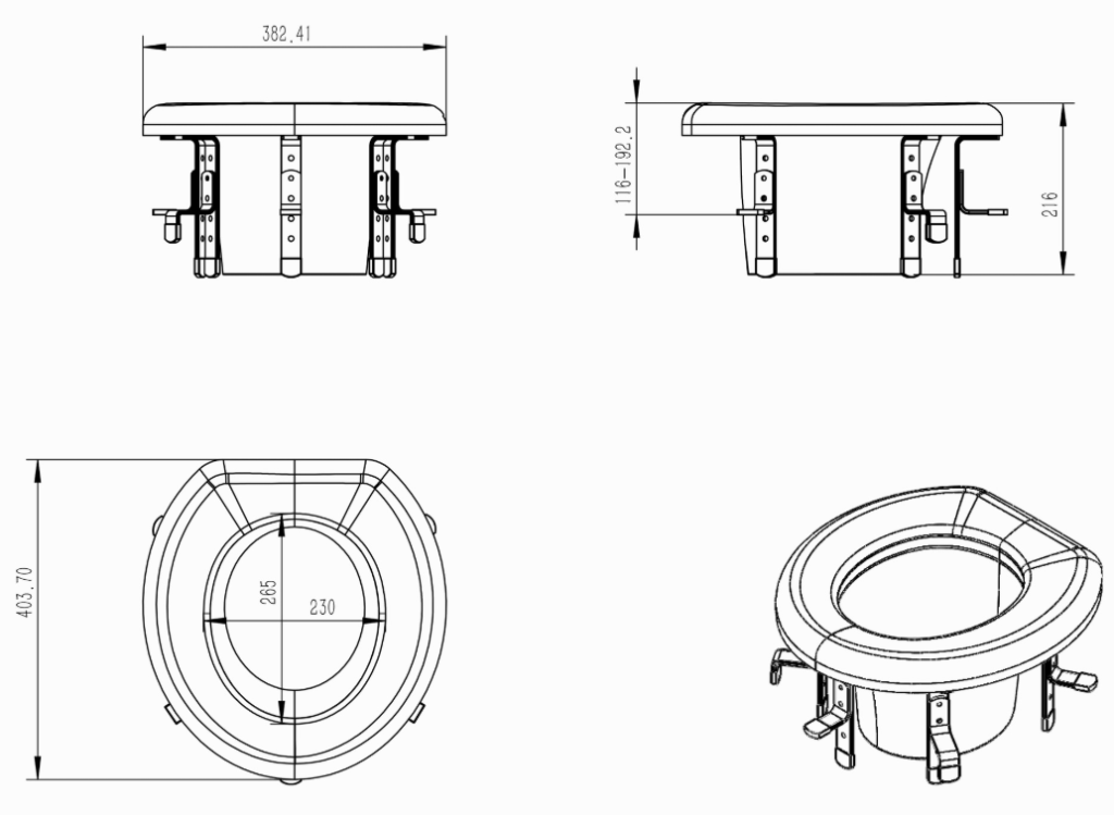 Насадка позволяет с комфортом пользоваться унитазом людям с инвалидностью, пожилым людям, а также в период реабилитации после поражения опорно-двигательного аппарата. Устанавливается на унитаз и позволяет регулировать высоту сиденья от 8 до 18 см. Сиденье выполнено из пластика, который не впитывает запахи и легко моется; опоры крепежа стальные с резиновыми наконечниками против скольжения.