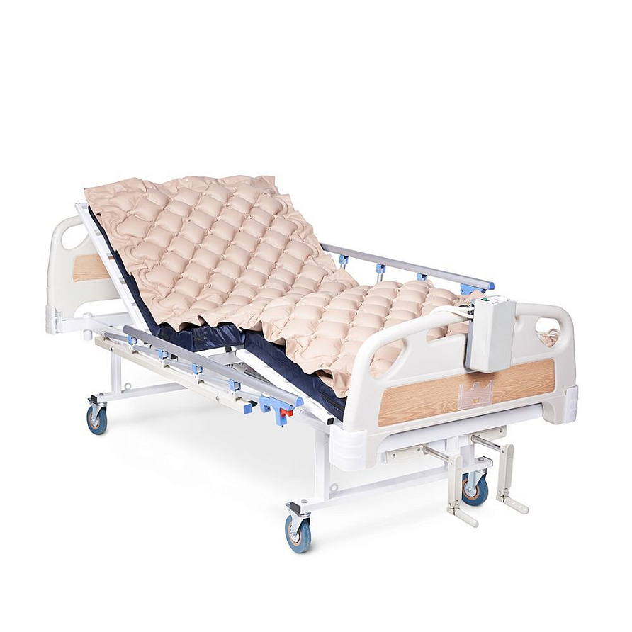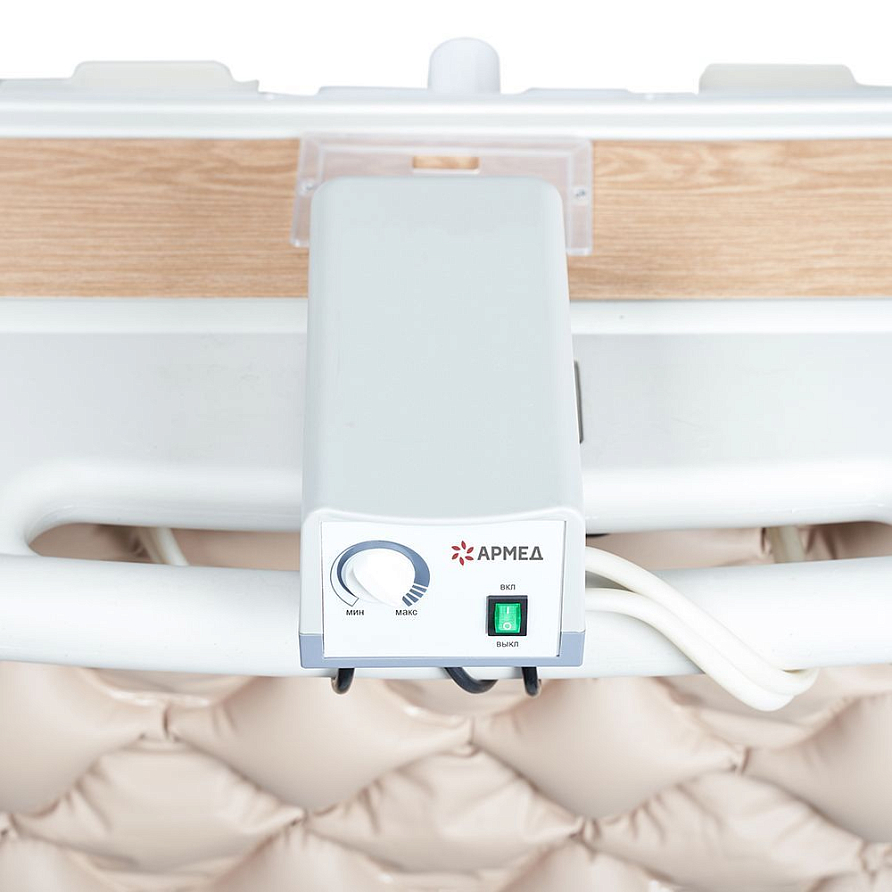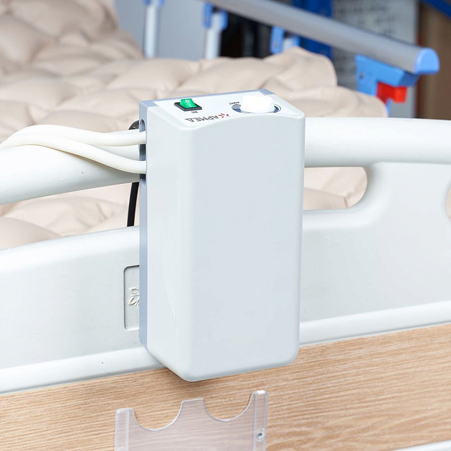 Секции наполняются воздухом с помощью небольшого компрессора, который надежно крепится на поручне кровати с помощью крючков. Плавная регулировка давления позволит подобрать наиболее комфортную плотность ячеек для пациента.