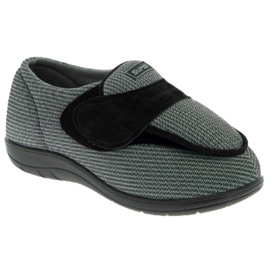 Домашние анатомические полуботинки с увеличенной полнотой-легкие и удобные, предназначенные специально для людей с патологиями стоп (вальгусная постановка первого пальца ноги, молоткообразная деформация пальцев, отечность, лимфостаз, ревматическая стопа, диабетическая стопа). Комфортная стильная модель для дома и не только. Съемная ортопедическая стелька с текстильным покрытием, обладает бактерицидными, противогрибковыми и абсорбирующими свойствами, обеспечивает благоприятный микроклимат внутри обуви и комфорт при носке. Стелька так же обеспечивает улучшенную амортизацию при ходьбе, обладает гигроскопичностью и предотвращает скольжение стопы. Так же в данную модель вложена дополнительная стелька из микропоры, что позволяет менять полнотность обуви. Широкая липучка обеспечивает большое раскрытие, позволяя легко надеть обувь на любую ногу и отрегулировать модель по подъему и полноте. Благодаря мягкой растяжимой подкладке и верху из текстиля обувь отлично адаптируется к увеличенному подъему и деформированным.